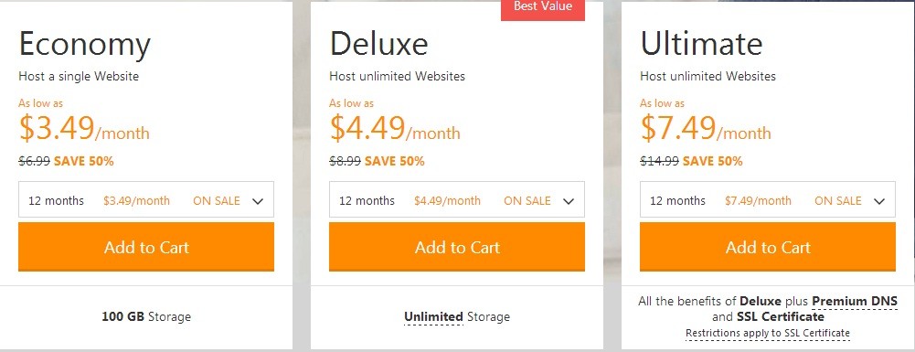 On the other hand, when it comes to GoDaddy, they have three plans; namely, economy, deluxe and the ultimate plans. All these plans provide unlimited bandwidth. The economy plan can host one domain while the other two can host unlimited.
